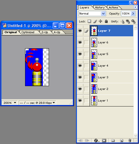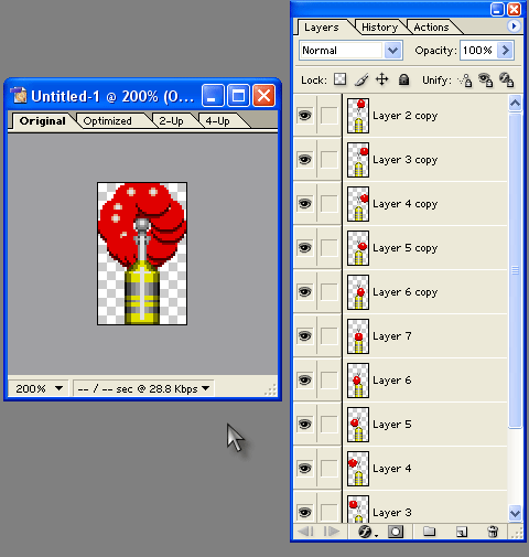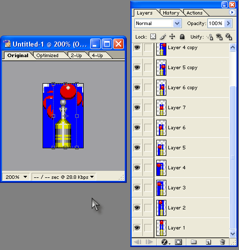 Теперь давайте разместим все слои-кадры в порядке их следования в анимации, для чего нужным образом перетащим слои (для перетаскивания нажмите на строку слоя и, не отпуская кнопки мыши, передвиньте вверх или вниз) и придадим им порядок снизу вверх (или наоборот): Layer 1, Layer 2,... Layer 7, Layer 6 copy, Layer 5 copy,... Layer 2 copy (и всё-таки ориентируйтесь не по названию, а по маленькой иконке-пиктограмме слоя, ведь это лишь один из вариантов расположения, который "сработает" у вас только в том случае, если вы в точности повторяли выше описанные действия).