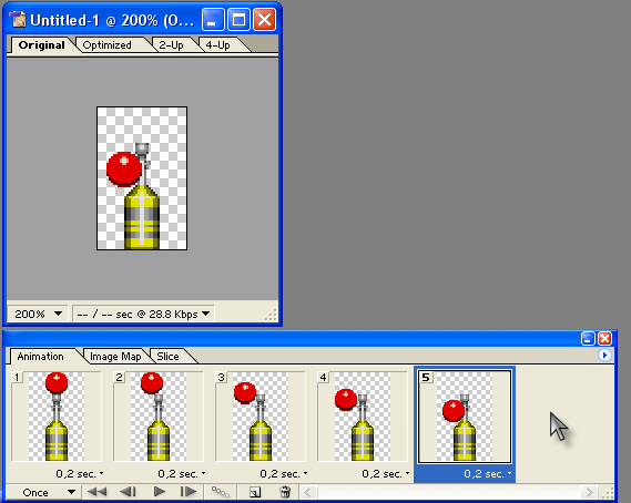 Как видите, создание анимации - не такой уж и сложной, но зато очень увлекательный процесс! Попрактикуйтесь, создайте несколько анимированных картинок! В следующем уроке я расскажу, как можно оптимизировать процесс создания анимации и расскажу о некоторых специальных функциях программы Image Ready! До встречи в следующем уроке!